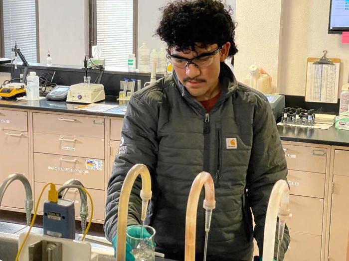 Alejandro Beltran, a water treatment technician at the Foothills Treatment Plant, collects a water sample for testing. Photo credit: Denver Water