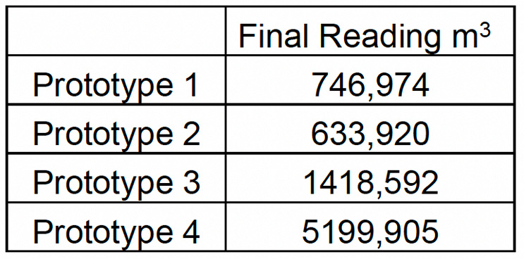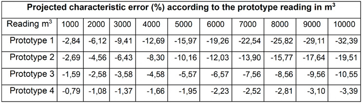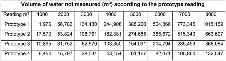 The water that each prototype will have stopped measuring (lost volume) for every 1000 m3 accumulated reading is: