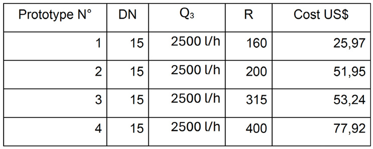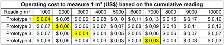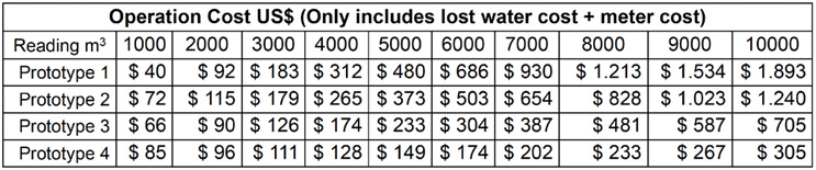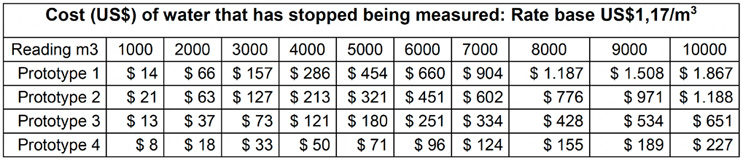 If a rate of $1,17/m3 is assumed for the reference socioeconomic stratum (4), the cost of lost water will be calculated for each prototype according to the accumulated reading. The results can be seen in the following table: