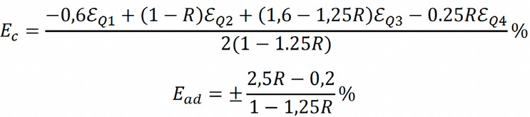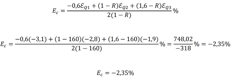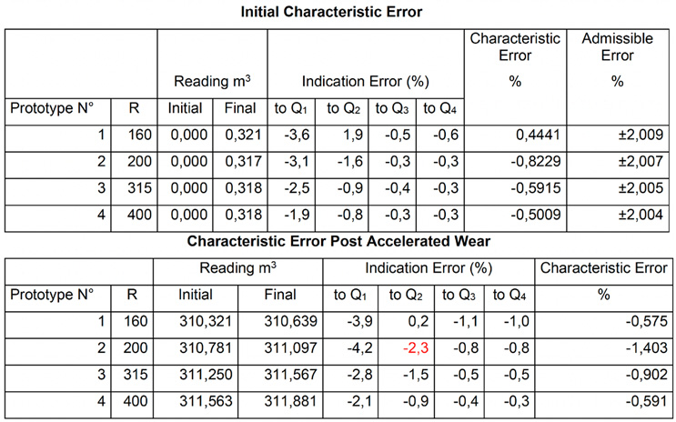 Next, the application of the proposed solution is presented to verify if Prototype No. 1 is indeed the best metrological option for the award. As a first measure, the characteristic errors of the initial and post-wear test are calculated, as well as the admissible errors corresponding to the metrological classes or R Ratios involved. The formulas that apply are: