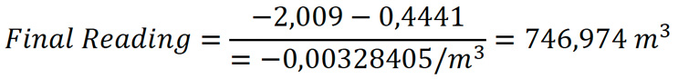 Consequently, the operating cost to measure one cubic meter within each of the previous reading ranges is obtained by dividing the total operating cost by each of the limit values of their corresponding reading ranges. The resulting operating costs are presented in the following table: