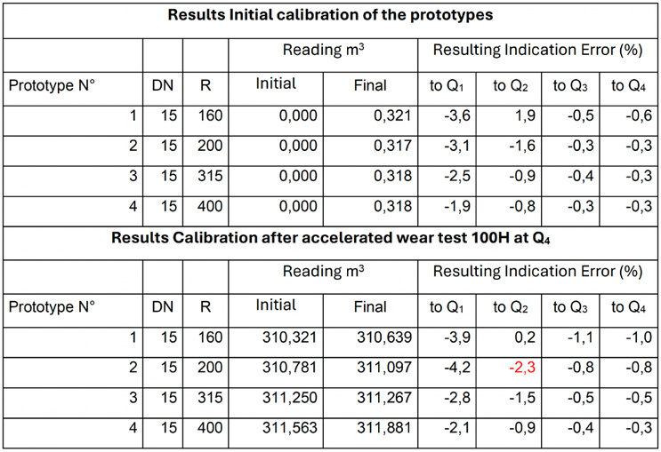 The prototypes were tested, and the following table of data was obtained that resulted from the initial calibration and a subsequent calibration performed after the 100-hour accelerated-wear test at flow rate Q4.