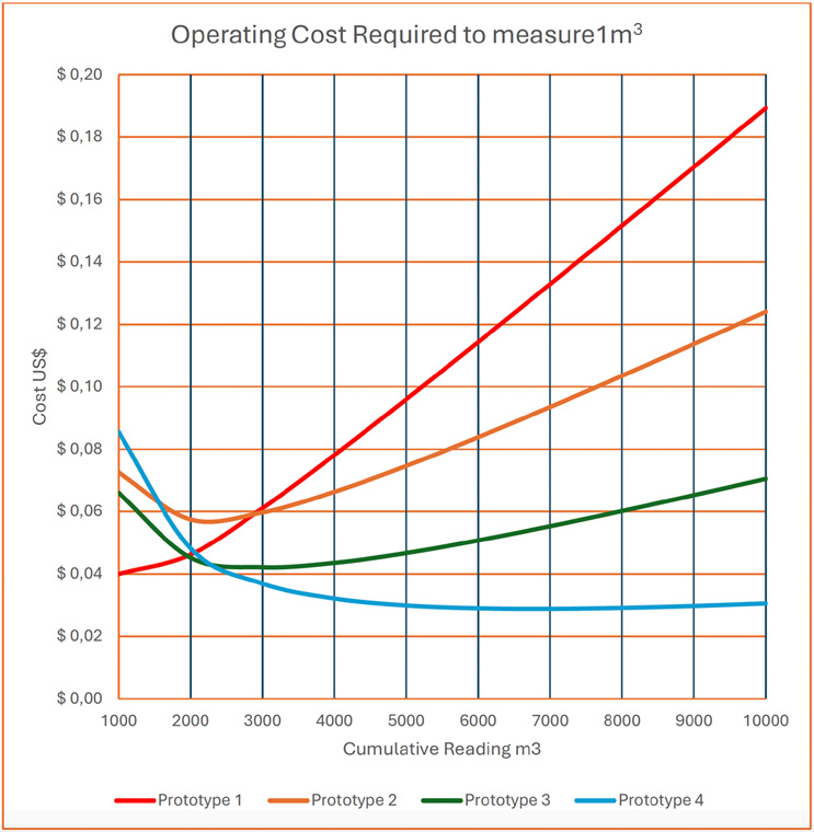 In the previous table, it can be seen that the lowest value for Prototype 1 is in the range of 1000 m3, presenting successive increments as the accumulated reading increases. For Prototype 2, the lowest value is in the range of 2000 m3; for Prototype 3, the lowest value is in the range of 3000 m3; Prototype 4 shows that the operating cost required to measure 1 m3 has its maximum value in the range of 1000 m3 range, which decreases successively until reaching a lowest value, which occurs in the range of 7000 m3. Note that for Prototype 4, from 4000 m3 to 10000 m3, the lowest measurement values of all the prototypes considered are presented. The corresponding curves are shown in the following figure.