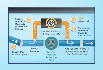 These systems work on rudimentary hydropower principles — an impeller’s blades rotate as water flows through a turbine at pressure. This mechanical energy is turned into electrical energy by a generator-like component, with the resulting power used either for local utility functions or returned to the grid.