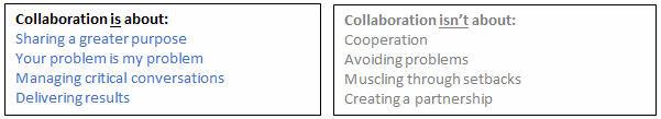It’s also very important to remember that, ultimately, collaboration isn’t only about a sense of partnership or shared vision: It’s about results. It’s good to have an awareness of cultural issues and operating practices, but only insofar as this focus delivers the aspirational results. The purpose of the collaboration is to achieve something that each partner is unlikely to achieve on their own.