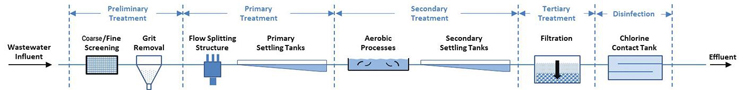 As an illustrative example, consider the typical process flow diagram for conventional biological treatment of wastewater shown in Figure 1.