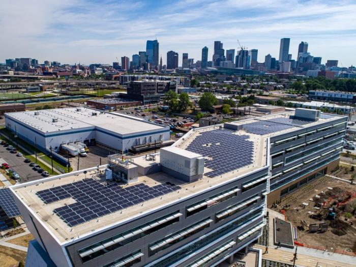 Solar power panels on the roof of Denver Water’s Administration Building helped the building receive a LEED Platinum certification, signifying the sustainable aspects of its design and operation. Photo credit: Denver Water.