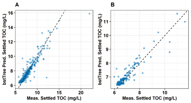 Predicted versus measured values of settled TOC for HRSD’s SWIFT Research Center bstTree ML model, showing the accuracy for the (A) training set and (B) testing set.