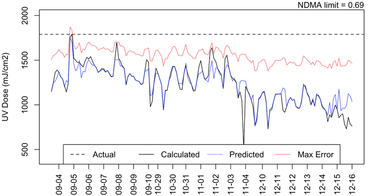 A comparison of predicted UV dose requirements for NDMA treatment for the Las Virgenes-Triunfo Pure Water Facility showcases the potential for energy savings with safety factors for the max error observed.