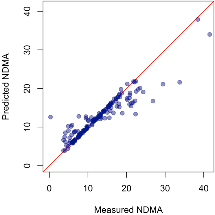 Predicted versus measured values of NDMA before UV/AOP at OCWD’s Groundwater Replenishment System.
