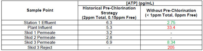 According to these results, it is clear that the cleaning cycle did an excellent job to clean the fouled membranes. The product water quality is now in the acceptable range (< 10pg/mL) and therefore carries a lower risk for microbial proliferation downstream assuming that an acceptable disinfectant residual is maintained. It was now clear that a certain degree of disinfection was necessary to minimize fouling of the pre-filters and membranes in the plant, so after the cleaning process, the following changes were instituted to the operating procedure: