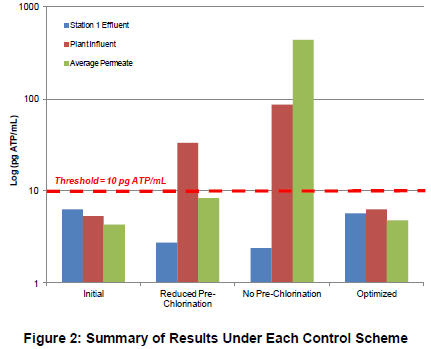 While the overall cleanliness of the product water has risen slightly, the overall picture is significantly better than when the membranes had become fouled earlier in the summer. The plant’s strategy was then to perform semi-routine tests on the water downstream of the pre-filters as well as the combined membrane product water to detect deviations from baseline conditions to take a more pro-active stance. The following graph shows a summary of results from the beginning compared to the optimized conditions (expressed as Log(pg ATP/mL)):