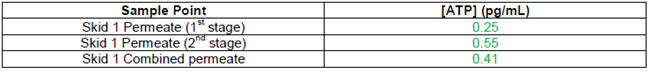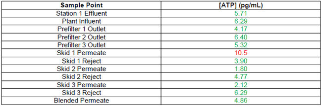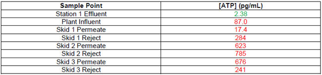 After an additional week under these conditions, though, the treatment plant was shut down due to excessively high pressure differentials across the membranes. The ATP results at the time of shut-down were as follows: