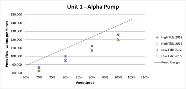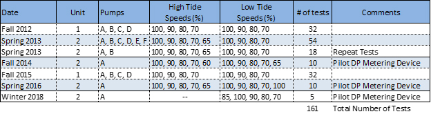 A considerable amount of pump performance data was obtained over the eight-year duration of the study as shown in Figure 1. In total, 161 individual tests were performed (see Table 1). This body of data confirmed the repeatable performance characteristic of flow versus pump speed. For example, Unit 1 Alpha pump was tested many times, at differing tidal (head) conditions, at multiple speeds, over several years. See Figure 2 for a graphical depiction of these results.