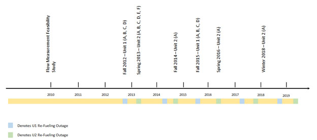 In order to validate the proof of concept of the ad-hoc differential metering device, Alden conducted both physical and numeric modeling (Unit 1 physical model in 2012 and numeric modeling of Units 1 and 2 in 2014 and multiple field flow measurement tests of all pumps of Unit 1 in 2012 and 2015, and Unit 2 in 2013. In addition, repeated confirmatory flow measurement tests of the in situ meter were performed in November 2014, May 2016, and February 2018. These tested were conducted to validate the pilot DP metering device. Long term monitoring of the DP flow system began in November 2014 and concluded in May 2016 with additional data acquisition during the winter of 2017/2018. See Figure 1 for an overall project timeline.