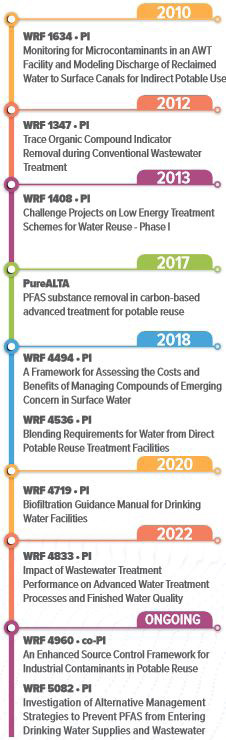 The water industry has done significant research on the toxicity, measurement, and removal of chemicals. Carollo has long been at the forefront of this research, with projects dating back more than a decade (Figure 1). Recurring themes in this research have included: (1) chemical removal in wastewater or reuse, (2) PFAS, and (3) narrowing the numerous chemicals to key indicators or monitoring priorities. Two recent projects are highlighted in this article.