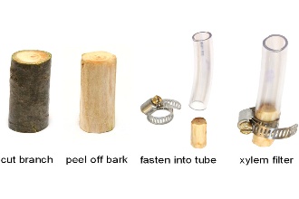 To study sapwood’s water-filtering potential, the researchers collected branches of white pine and stripped off the outer bark. They cut small sections of sapwood measuring about an inch long and half an inch wide, and mounted each in plastic tubing, sealed with epoxy and secured with clamps.