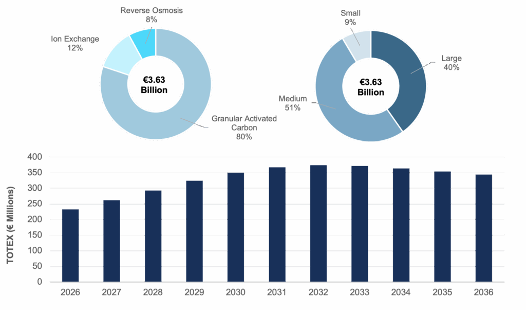 Four countries—Germany, Italy, France, and Spain—are projected to account for roughly two-thirds of total PFAS drinking water treatment spending, reflecting their large installed treatment bases, stronger enforcement momentum, and greater exposure to legacy contamination risks. Germany leads at €1.1B, followed by Italy (€0.9B), France (€0.7B), and Spain (€0.4B). Outside these leading markets, adoption is expected to ramp up more gradually as smaller countries pursue regional compliance strategies, phased retrofit programs, and risk-based prioritization of higher-exposure supply zones.