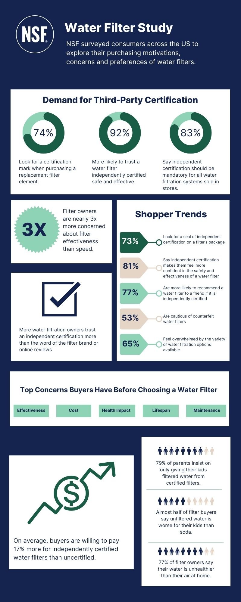 "This data underscores the critical role of water filtration in addressing consumers’ concerns about tap water quality," said Dave Purkiss, Vice President at NSF. "It also highlights the pivotal importance of independent certification in instilling trust and confidence in water filtration products. Products that bear the NSF certification mark assure customers that the product meets stringent standard requirements that are accepted throughout the water industry and that the product claims have been independently tested and verified. This helps gives consumers peace of mind knowing that their filter is actually doing what it claims to do."