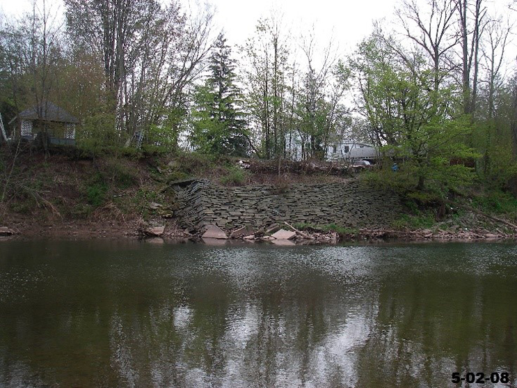 Before photo. Stone wall sliding down into the West Branch Delaware River at South Street. (Credit: DCSWCD)