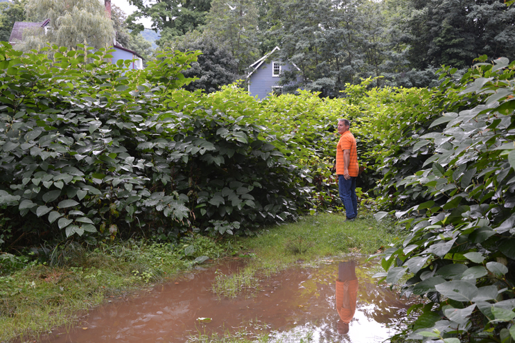 Before photo. Graydon Dutcher walking Army Corps personnel through the tall invasive plants on the Walton floodplain in the Town of Walton in 2016. (Credit: JoAnne Castagna, public affairs)