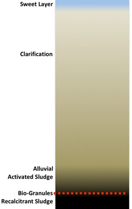 The inter-cell transfers occur low in the water column so that suspended solids enter in the fluidized bed of the downstream cell, not in the clarified supernatant. Your detention time is used for gas formation, not settling. The sweet layer is discharged from the final cell.