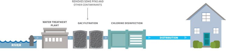 One common method for treating drinking water is granular activated carbon (GAC). This method is used by many public water utilities because it is highly effective at removing a range of drinking water contaminants, including some PFAS. Similar carbon-based media is used in some home water filters, though these vary in what contaminants they are certified to remove and how long they are effective before needing replacement.