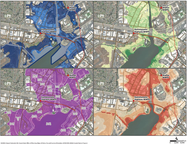 - Detailed maps and cross sections illustrating the extent and depth of enhanced flooding threats to wastewater facilities within the SISB, including 17 WWPSs and the Sand Island WWTP (Figure 1).