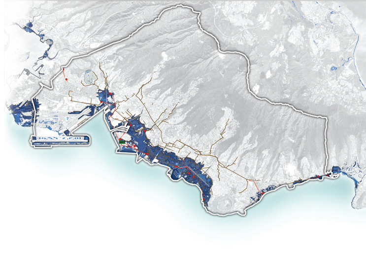 The vulnerability assessment used a two-pronged approach — a desktop analysis and site visits/interviews. The desktop analysis took into account critical facility information from drawings and compared them to historical observations and projected threat scenarios. The work products of this analysis included drawings that indicate critical flood levels and pathways, as well as aerial maps (Figure 2).