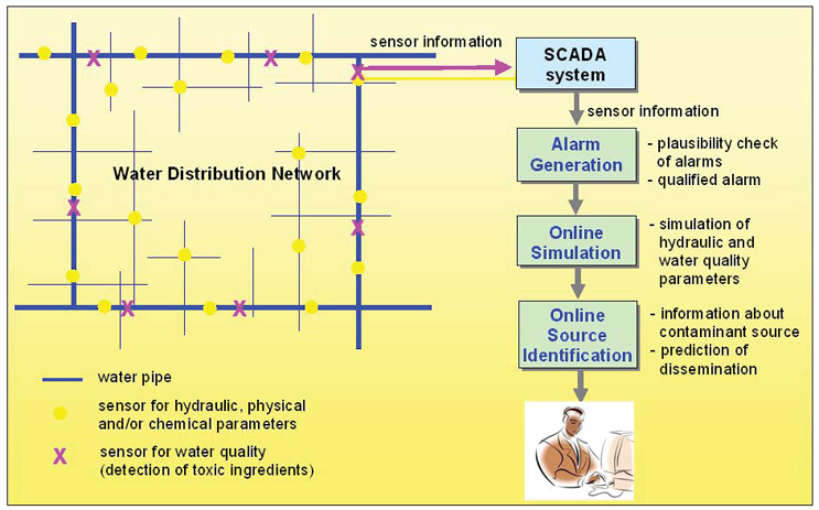 The security of drinking water is increasingly recognized as a major challenge for municipalities and water utilities. The safety and/or security of drinking water can be threatened by natural disasters, accidents, or malevolent attacks (Gleik, 2006). In the event of a contamination, the material can spread within the water rapidly and extensively before the problem is detected. Contaminated drinking water can induce widespread illness or death, disrupt economic life, and create mass panic. First-generation software packages and sensors are available — such as Guardian Blue from Hach Lange and Canary from the U.S. EPA — for managing drinking water safety and security and, in particular, for detecting incidents. These allow for an overall management of water security, including the systematic collection and interpretation of information by online sensors. However, this first generation of tools suffers from a range of serious shortcomings: