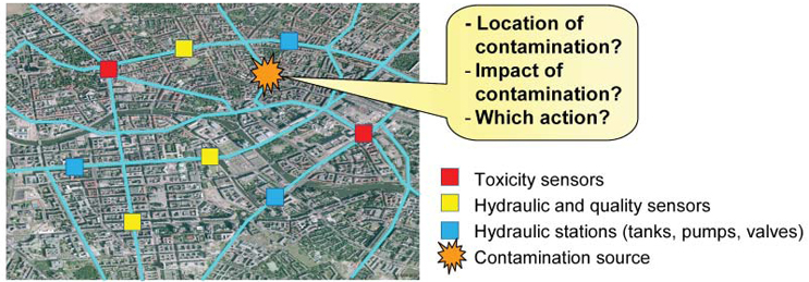 The main objective of the project SMaRT-OnlineWDN (duration: 2012 – 2105; see SMaRT-OnlineWDN (2015)) was the development of an online security management toolkit for water distribution networks (WDN) that is based on sensor measurements of water quality as well as water quantity. The French-German cooperative research project consists of end users (BWB in Germany, CUS Strasbourg, and Veolia Eau d’Ile de France), technical and socio-economic research institutions (Fraunhofer IOSB, TZW, Irstea, ENGEES), and industrial partners on both French and German sides (Veolia, 3S Consult). In this project, the technical research work was completed with a sociological, economical, and management analysis. SMaRT-OnlineWDN combines applied mathematics, civil and environmental engineering, fluid mechanics research, and social science and economics in a multidisciplinary approach.