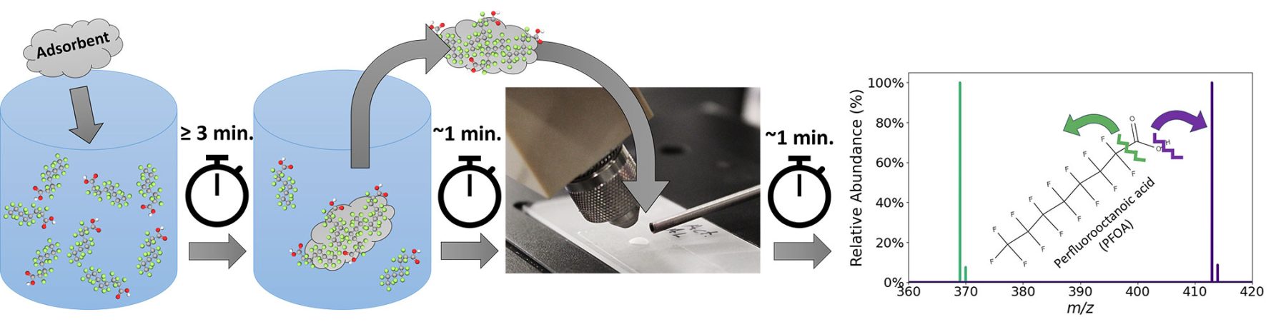 Their technique starts with an adsorbent about the size of a Rice Krispy. The adsorbent is placed in a solution for testing. Three minutes later, it is removed and placed in front of a mass spectrometer where it is sprayed with electrically charged droplets. The droplets remove PFAS from the adsorbent and carry it into the mass spectrometer, where it is analyzed for PFAS concentration and type.