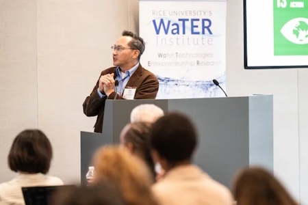 Rice faculty experts provided an overview of some of the technical innovations being developed on campus. Menachem Elimelech, head of the Rice Center for Membrane Excellence, spoke on advances in membrane-based desalination and wastewater reuse, highlighting how new materials can deliver fresh water more efficiently and with lower energy costs. Michael Wong, a leader of the Rice PFAS Abatement and Replacement Center, tackled one of the most urgent challenges facing the water sector: how to destroy per- and polyfluoroalkyl substances (PFAS or “forever chemicals”) once removed from water. Qilin Li emphasized the opportunities to recover critical elements such as lithium and rare metals from mining wastewater, geothermal brines and industrial effluents — materials vital for the clean energy transition. Rice WaTER Institute director Pedro Alvarez discussed microbial and catalytic approaches for water purification and resilient infrastructure.