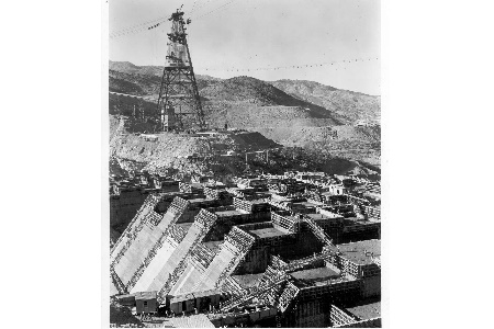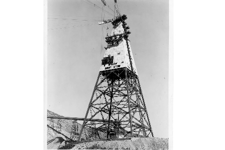 Construction of Northern California’s Shasta Dam began in 1937 and was completed in 1945. A system of steel cableway towers was erected to carry the concrete-pouring buckets used to place concrete in the dam during construction.