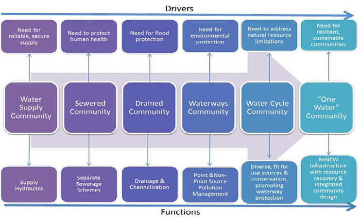 Sustainable integrated water management continuum (Source: WERF report number SIWM2T12, Institutional Issues for Integrated ‘One Water’ Management. Published in 2015.)