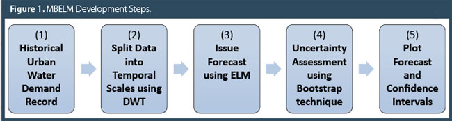 The MBELM model is a refinement of the model Wavelet-Bootstrap-Artificial Neural Network (WBANN), introduced to the UWD forecasting literature by Tiwari & Adamowski (2013). The authors utilize the discrete wavelet transform (DWT) (Mallat, 1989; Daubechies, 1990), which builds on the well-known Fourier transform, to decompose the original water demand record (time series) into multiple components that each characterize different temporal scales. The DWT captures high-frequency time series components and isolates these components into what are called “detail series” representing the fast-changing characteristics of the original record. Successive “details” may be extracted from the original record. The remaining signal content is called the “approximation” series and generally contains trends and slower-moving time series components. If one were to extract all possible details from the original record, the approximation series would represent the mean of the original UWD time series.