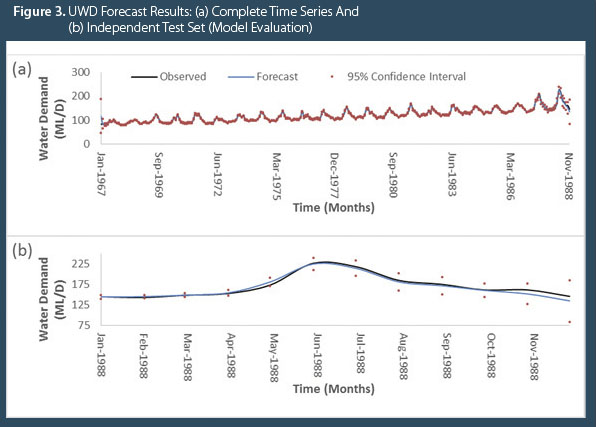 For the independent test set, the COD for the MBELM is 0.9679, meaning that the MBELM forecasts explain more than 96 percent of the variance in one-month-ahead observed UWD. The MAE for the same period is 3.8821 ML/D. Both scores indicate the highly accurate nature of the MBELM forecasts. The confidence intervals also embody all observations within the independent test set, highlighting the reliability of using the MBELM for one-month-ahead revenue projections.