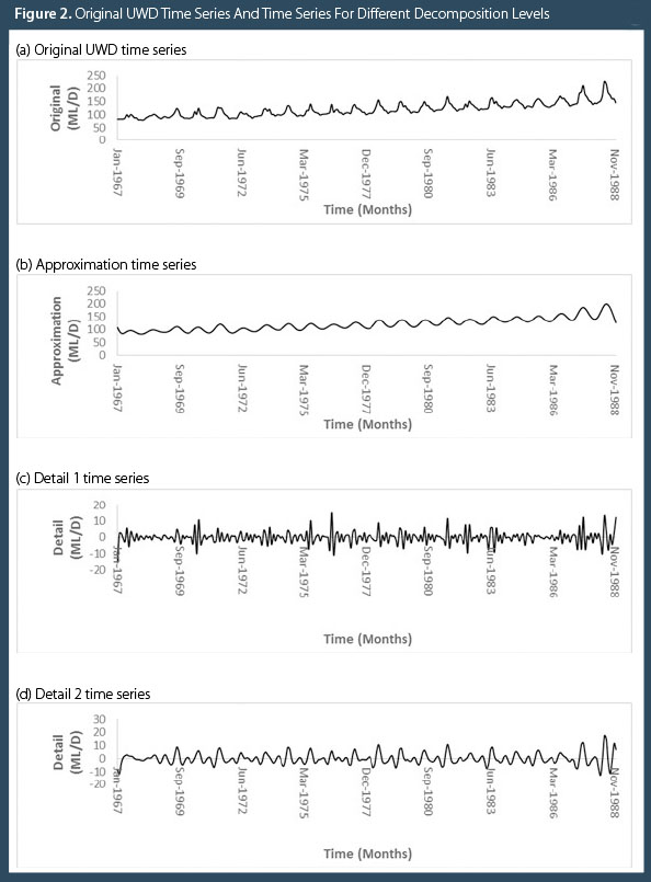 It is clear from Figure 2 that there are cyclical components embedded within the original time series. This highlights the usefulness of the DWT at extracting these important time series characteristics and exposing their periodic nature through time, which is not fully apparent in the original UWD record. Perhaps the most important characteristic revealed through the DWT decompositions for this time series is the extremely periodic nature of the approximation sub-series, which coincides with a 12-month periodicity superimposed on an upward trend. The two details series exhibit random, and at times sharp, changes from their regular periodic patterns.