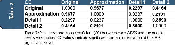 The results for step 2 of the MBELM development procedure (Figure 1) are presented in Figure 2, while steps 3 to 5 are shown in Figure 3. Table 2 provides Pearson’s correlation coefficient (CC) matrix examining significant correlation between each wavelet decomposed sub-series (WDSS) and the original time series at the 0.05 significance level.