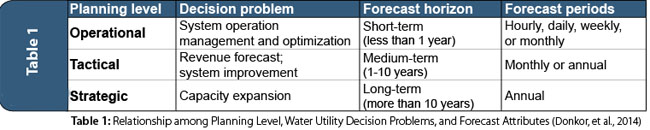 Recently, House-Peters & Chang (2011) explored the UWD modeling literature from the past three decades and identified four themes that are important. In this regard, we discuss two of these topics that are relevant to this article: (1) interactions within and across multiple temporal scales, and (2) acknowledgement and quantification of uncertainty. To understand the broad context of UWD forecasting applications at different scales, Donkor, et. al (2014) summarized their findings related to the planning level that the forecasts can support as the following three categories: operational, tactical, and strategic (presented in Table 1). Most recently, it was identified through a survey of water utilities under the Water Research Foundation’s co-funded project on short-term UWD forecasting (Fullerton, Forthcoming) that water utilities’ most crucial need for short-term forecasting is tied to revenue and expenditure projections. Generally, the most prevalent billing cycles occur at monthly, bimonthly, and quarterly periods.