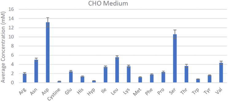 Figure 3. Average concentration of amino acids measured on the REBEL analyzer in chemically-defined media. 6 samples of the medium were prepared, aliquoted 6 times into a 96 well plate and the REBEL performed 5 replicate measurements for each sample (n=180). Average concentrations and standard deviations for each amino acid detected are shown.