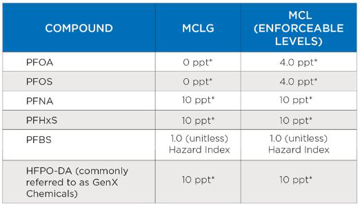 - MCL goal of 10 parts per trillion for perfluorohexanesulfonic acid (PFHxS), perfluorononanoic acid (PFNA), and Gen X (HFPO-DA) chemicals.