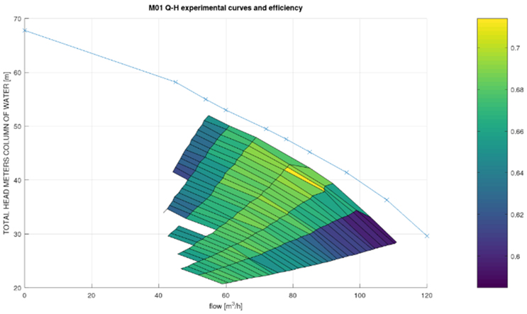 The integration of the experimental results into a cloud-based IoT platform facilitated the real-time monitoring and intelligent control of pump operations. The system continuously assessed real-time demand conditions and hydraulic feedback, adjusted the rotational speed (ν) of each pump dynamically to maintain operation within the BEUP envelope and ensured optimal performance across varying diurnal and seasonal demand profiles, minimizing specific energy consumption (kWh/m³) and enhancing operational resilience.