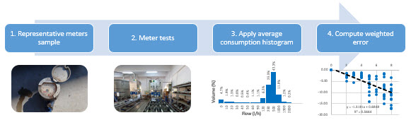 These meters were tested under typical operating conditions at nine flow rates — starting flow, 15, 30, 60, 120, 200, 680, 1500, and 3000 liters per hour (L/h). Each meter was tested three times to improve results reliability. The resulting measurement errors were analysed in relation to the customer consumption patterns, allowing for the calculation of an average metering error to each meter. A weighted error was computed for each age group, starting with new meters to establish the initial metering error, and extending to subsequent years to determine the degradation rates over time.