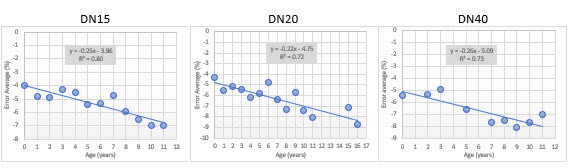 For DN15 meters, 127 units were tested, the linear regression indicated strong confidence in the results (R² = 0.80). The initial error was -3.96%, with an annual degradation rate of -0.25%. For DN20 meters, 165 units were tested, and the regression yielded a confidence level of R² = 0.72. The initial error was slightly higher than for DN15 at -4.75%, and the annual degradation rate was -0.22%. DN40 meters had the smallest sample size (31 units), with limited data for newer and older meters. Still, regression analysis delivered a reasonable R² of 0.73, with an initial error of - 5.09% and an annual degradation rate of -0.26%. An additional checking of results was carried out by comparing them with tests conducted by other water utilities in Portugal and Chile where AGS is currently working. The performance of both DN15 and DN20 meters in RAJA Constanta showed strong alignment with the findings from other companies.
