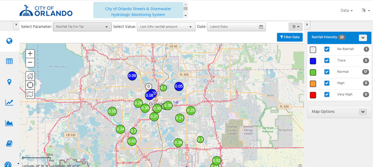 The data is easily accessible in real-time through an online dashboard for all stakeholders to prioritize and focus their efforts where needed. To broaden the sharing of data, in 2019 the City chose to make rainfall and stage information available to the public through https://hydrology.orlando.gov/.