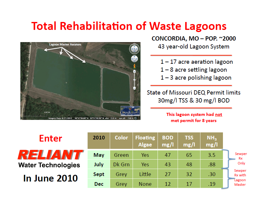 In 1967 the City of Concordia, MO built a segmented lagoon system to handle the small town’s waste requirements. The main industry in Concordia is a Tyson renderings plant, and the lagoon system was designed to also handle that plant’s final waste and water polishing requirements. The lagoon system was a relatively standard design, consisting of an 18.7 acre primary lagoon, a 5.6 acre secondary, and a 3.2 acre final lagoon. All lagoons average 6 feet in depth, with the final outfall being received by a southeasterly flowing Panther Creek. A number of vertical spray aerators were placed in the primary lagoon in order to provide water turnover and dissolved oxygen (DO) to the system.
