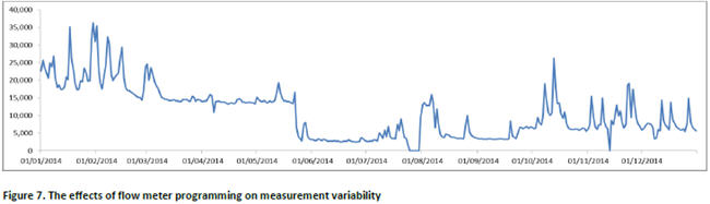 The risks of tampering or scaling errors for flow meter devices can have similar effects on the flow measurement system in that the flow meter can read significant amounts of error. Figure 7 shows where an error in the setup of the flow meter surrounding the distance from the bottom of the chamber can cause a variance of as much as 3.5 million gallons (13,000 m3) in the flow measurement readings.