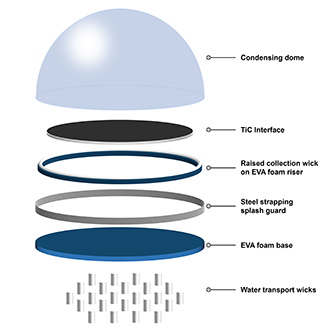 After placing the device in water, results can be seen almost instantly. A wicking system brings ocean water up to the foam surface of the device, where it’s evaporated by solar-heated plasmonic materials. With the salt left behind, the water recondenses on the clear plastic dome over the top of the device and is funneled down the sides where it’s collected in a sealed bag.