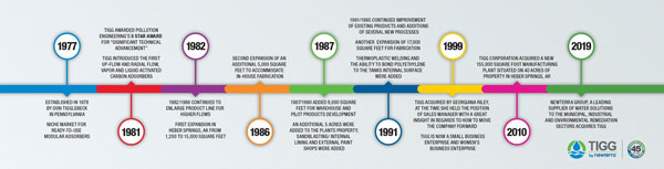 TIGG is proud to celebrate 45 years in business. In 1977, Don Tiggleback of Pittsburgh, Pennsylvania, was a chemical engineer working for an activated carbon manufacturing company, when he decided to try to package activated carbon media in steel vessels and sell complete pre-engineered, easy to ship, ready to use activated carbon adsorber equipment. Don, realizing that not all customers have the same needs, bought a steel tank manufacturing plant in Arkansas so that he could custom engineer and manufacture tanks to suit different needs and also so he could guarantee the quality of the vessels being built. From this concept, and naming the company after his given nickname of “TIGG” Don created TIGG, LLC. Now 45 years later, TIGG is an established provider of activated carbon adsorption systems, services, and rentals all over the world.